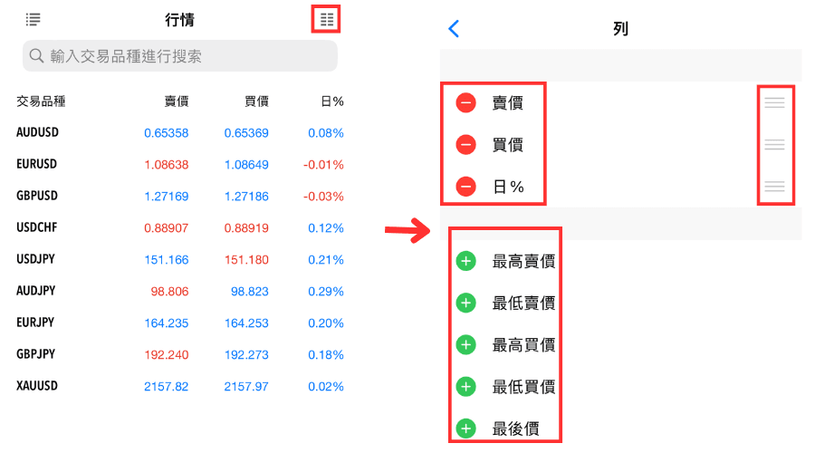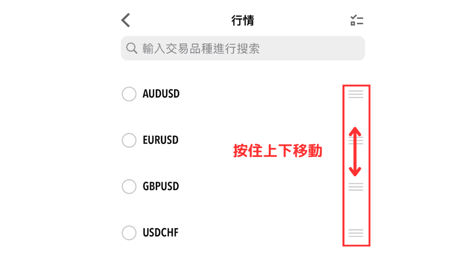 在高级模式中可以修改排列顺序。 在高级模式中点击右上方的笔形图标,显示交易品种一览后,按住交易品种右边的图标上下移动就可以修改排列顺序。