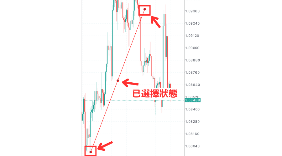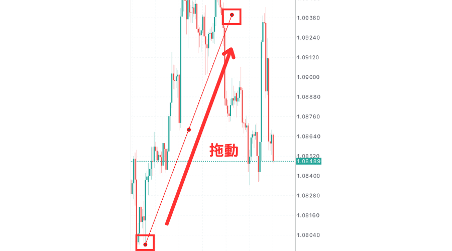 使用水平线或垂直线时只需要在图表中想要绘制的水平处点击一下就可以。 使用趋势线等线条时在图表中点击起点,然后再拖动至终点就可以。