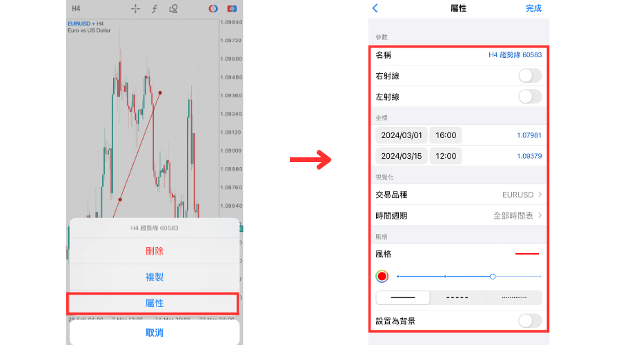 在线条上长按就会显示选单,然后点击「属性」,在属性界面中可以设置左右延长以及线条位置、颜色、风格等,最后点击「完成」就可以了。