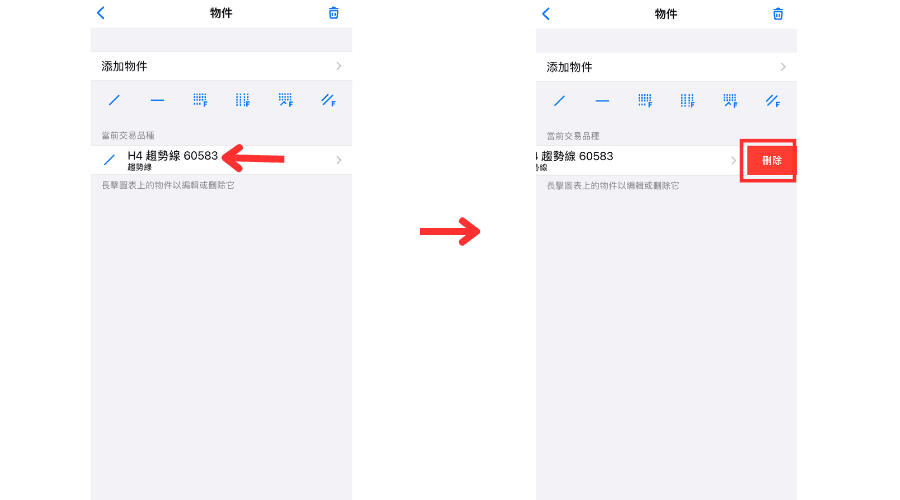 删除线条等物件时,点击图表上方的物件图标,或者在图表中点击一下,然后点击选单中的物件,这样就可以显示已添加的物件。