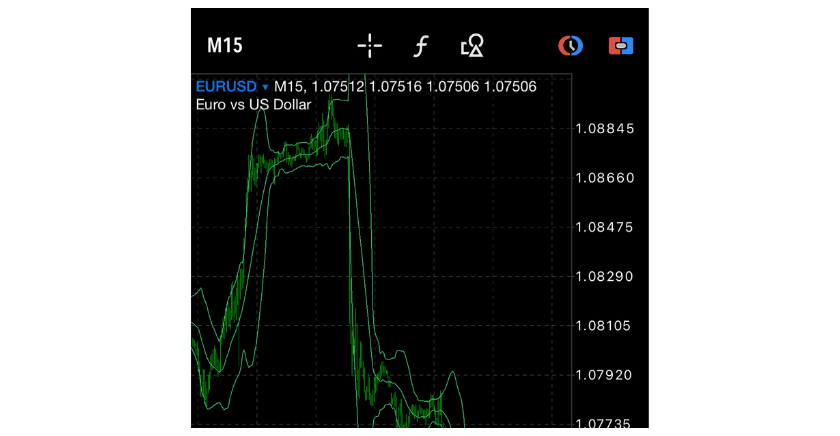 「图表」介面中可以查看交易品种的图表,以及使用移动平均线、MACD等指标,也可以绘画水平线和通道(物件)等,可以对图表进行各种分析。