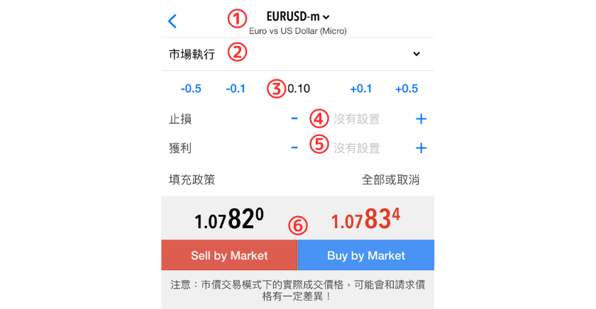 完成①~⑤设定后,点选⑥中任意一个选项,市价单就会被执行。 可以在「交易」界面中查看、修改或结算订单。