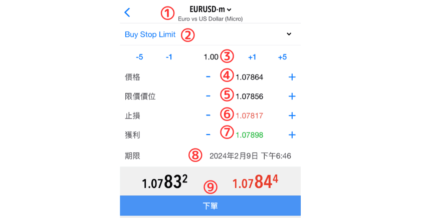 | Buy Stop Limit (买入停损限价单) | 在价格先涨后跌时进场做多(买入),即现价突破后出现回调,然后以限价单进场做多。 |