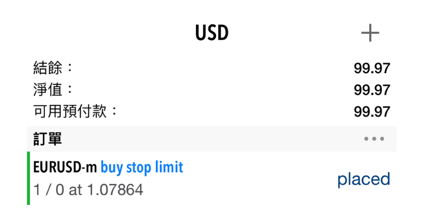 | Buy Stop (买入停损) | 在价格涨到现价上方的某个价位时进场做多(买入),也称为追涨单。 |