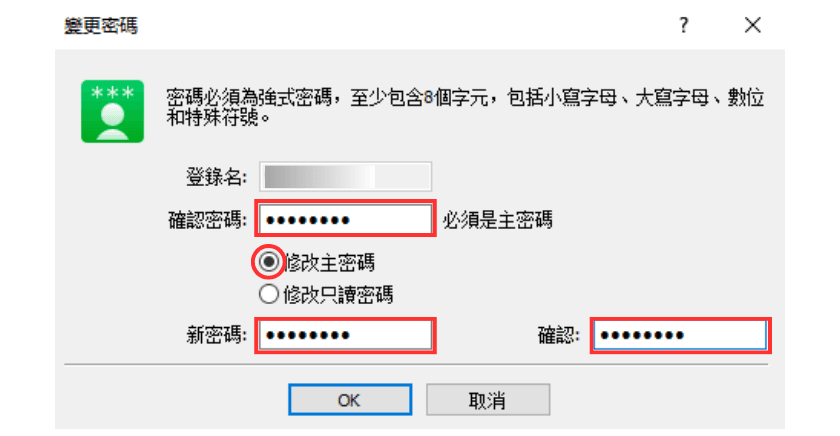 然后在「新密码」中输入想要设置的登录密码,在「确认」中再次输入一遍相同密码,最后点击「OK」就修改就完成了。