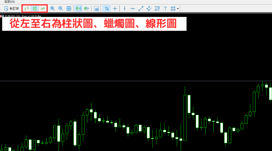 在MT5的工具栏中点击想要显示的图表类型图标,点击后就会切换为该图表。