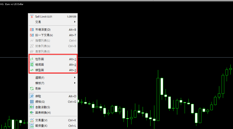 点击MT5菜单「图表」,点击想要显示的图表类型后就可以切换为该图表。