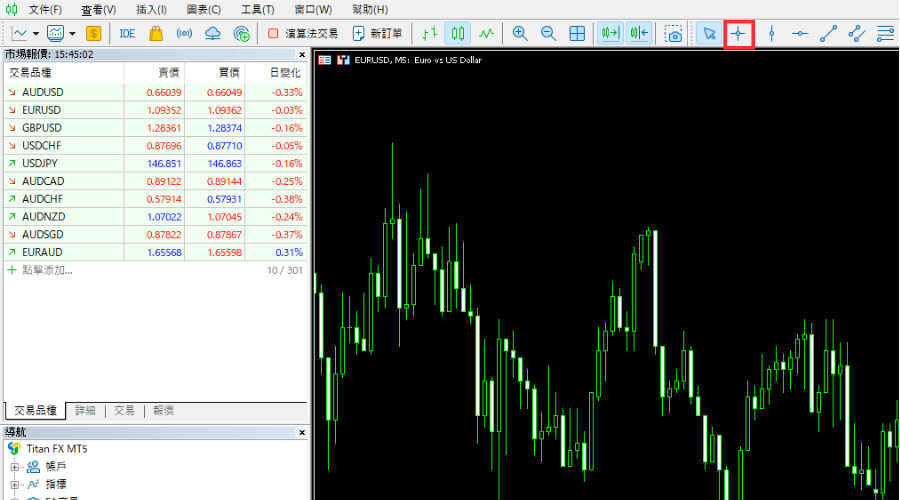 在MT5中,可以使用十字光标(光标)模式来确认光标位置的时间与价格,并且还可以计算K线的数量和点数。