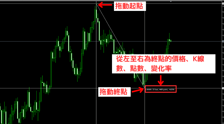 使用十字光标模式在图表中点击按住拖动,这样就可以显示出拖动起点至终点的K线数量、点数、终点的价格。