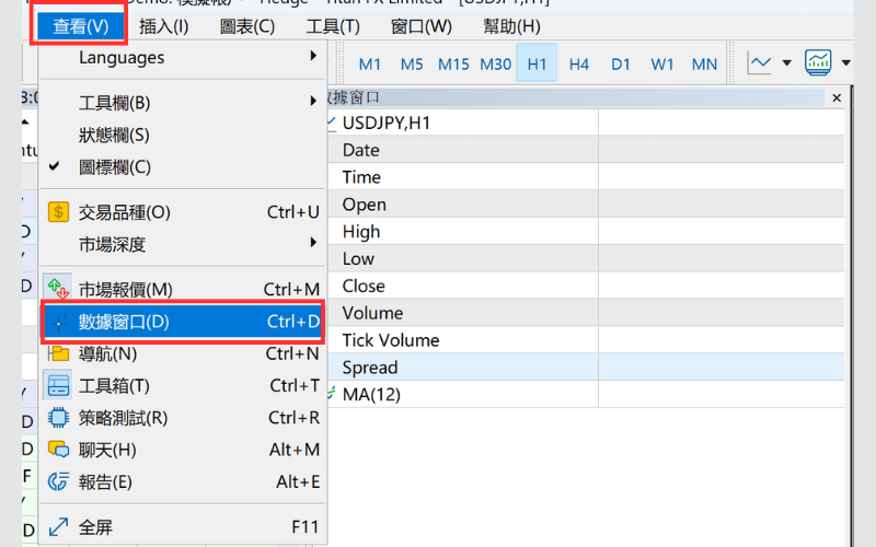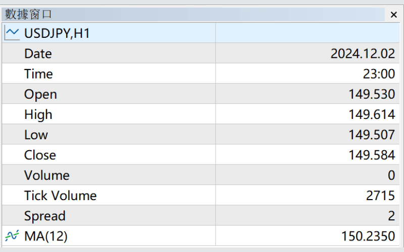 在MT5中,可以显示一个数据窗口,提供游标所在图表位置的价格等资讯。 具体来说,该视窗可确认日期、时间、四大价格、成交量等基本资讯,还能显示目前使用的技术指标数值。