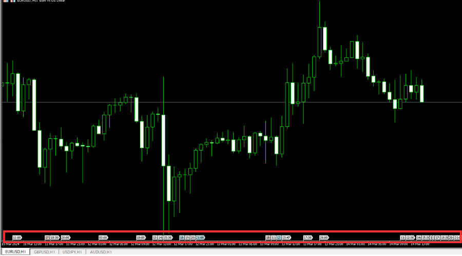 在MT5的图表中可以显示经济日历的时间(在图表下方显示时间,把光标移到上面就可以显示内容)。