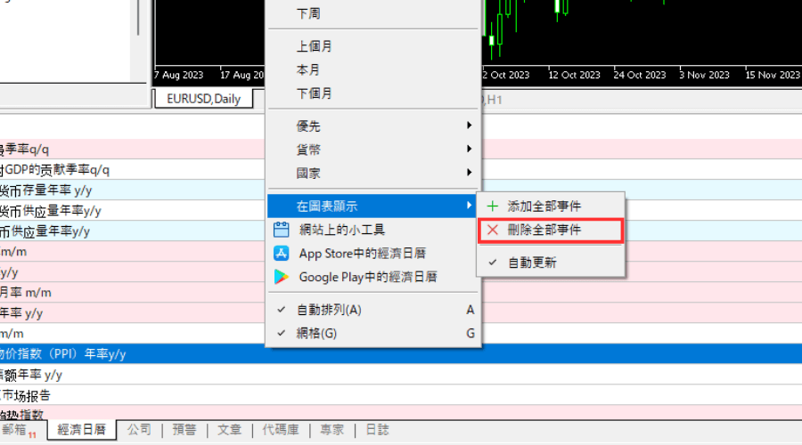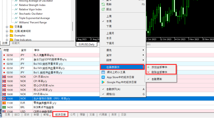 在经济日历中点击右键,然后点击「在图表显示」选单中的「添加全部事件」就可以在图表中显示,点击「删除全部事件」就可以隐藏。