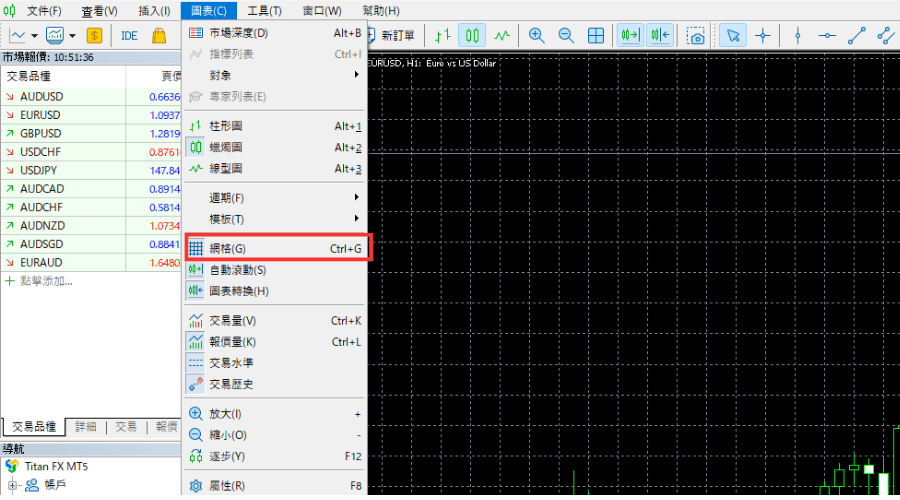 点击MT5选单「图表」中的网格可以切换为显示或不显示。