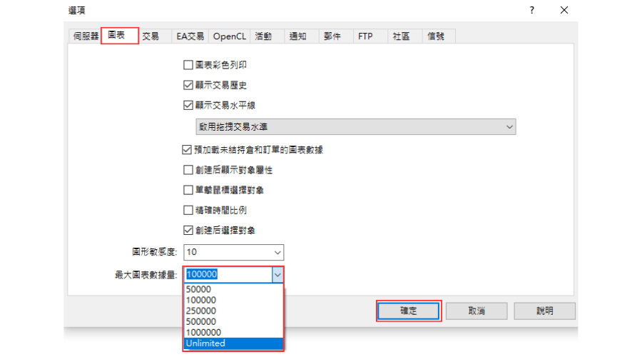 在「选项」窗口中点击「图表」标签,然后在最大图表数据量中选择「Unlimited」,点击「确定」,重启MT5。