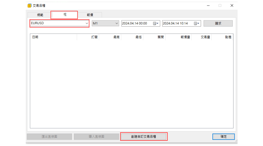 在「交易品种」窗口中切换为「柱」标签,把左上方的交易品种名称改为想要导入的交易品种名称,最后点击「创建自订交易品种」。