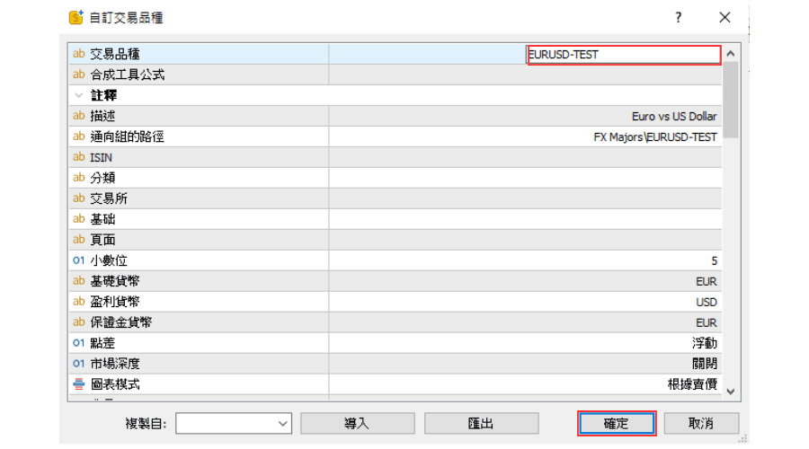 在「自订交易品种」窗口中,把右上方的名称修改为与现有交易品种不同的名称,然后点击「确定」。