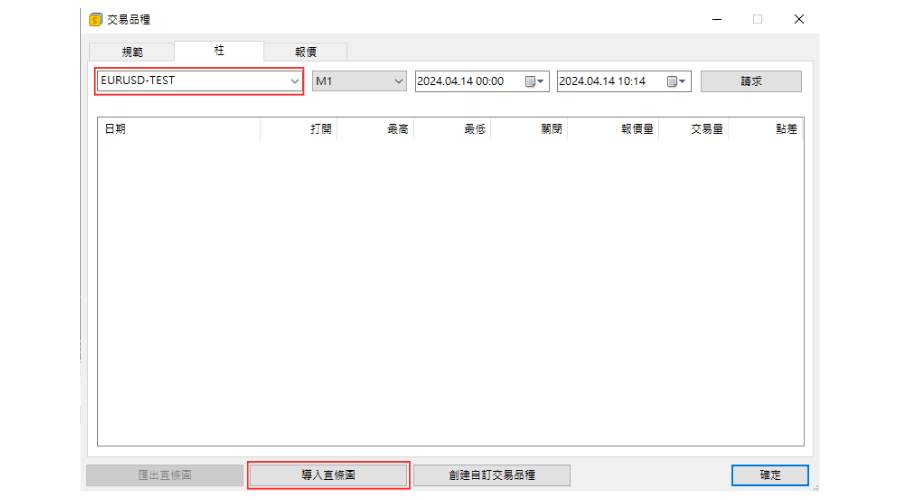 在「交易品种」窗口的「柱」标签中,把左上方的交易品种名称修改为创建的交易品种名称,然后点击「导入直条图」。