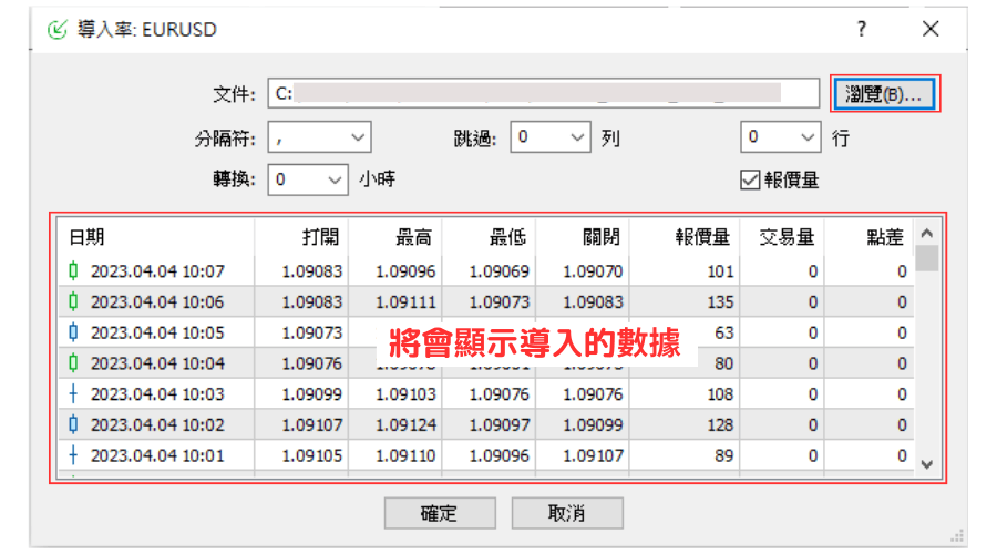 在「导入率」窗口中,点击右上方的「浏览」按钮,选择要导入的文件,然后调整好其他设定后点击「确定」。