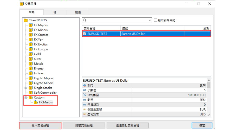创建的交易品种会保存在「Custom」列表中。