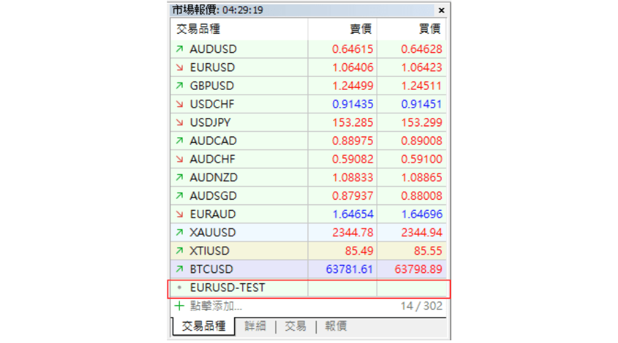 在市场报价中显示后,就可以打开图表或是进行回测。