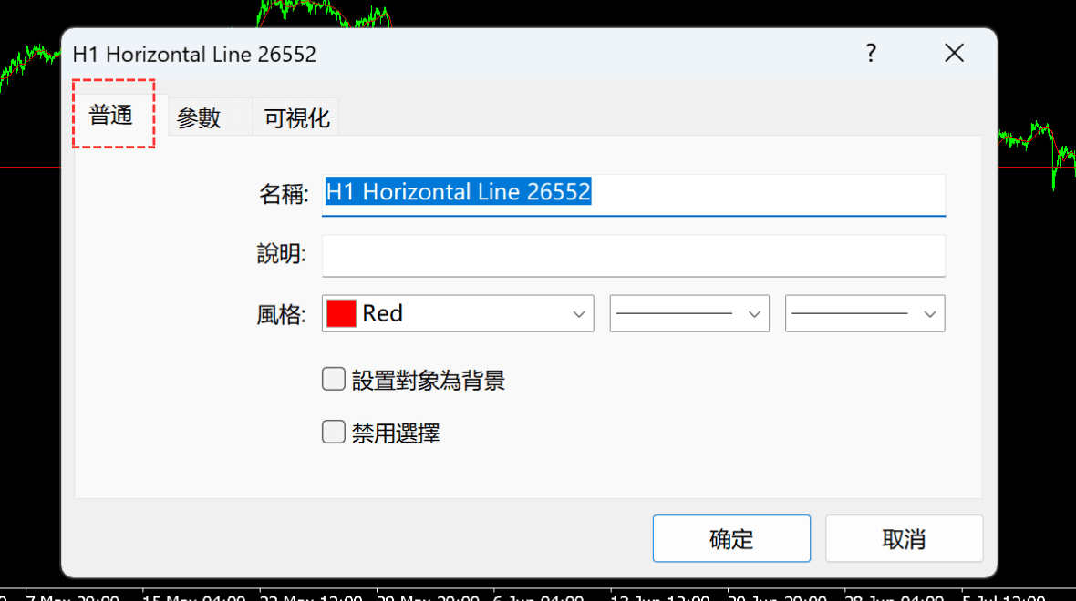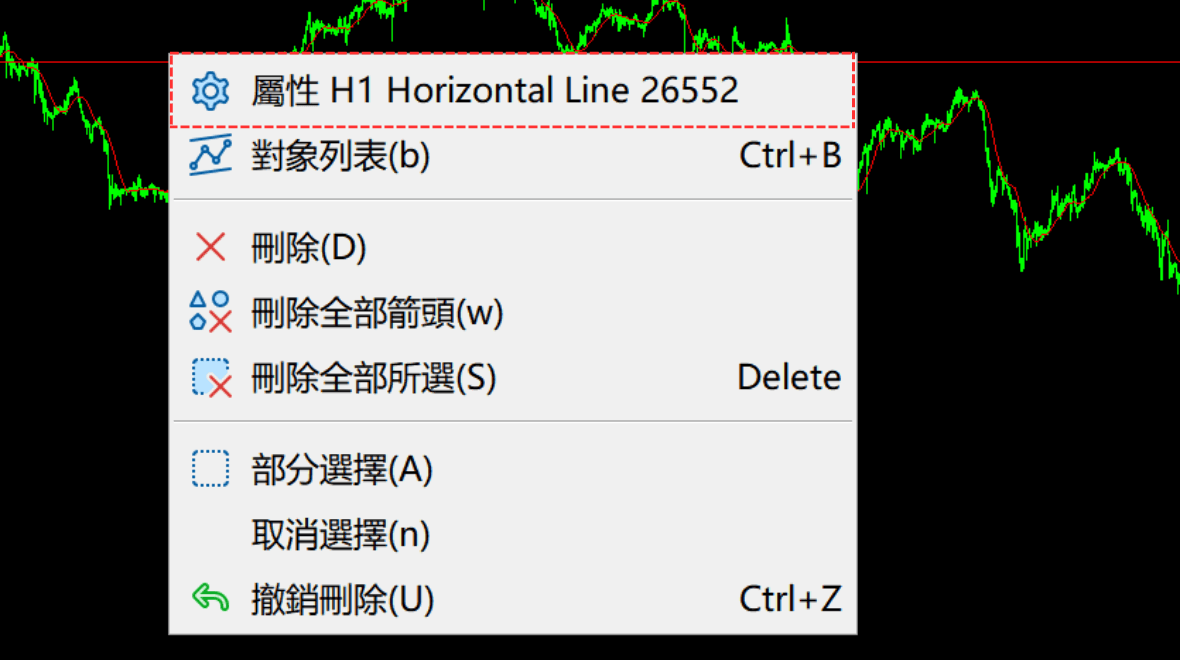 在选取水平线后,右键点击并选择出现的选单中的「属性时间轴Horizontal Line编号」,即可打开属性设定画面。
