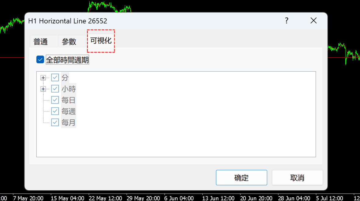 在「可视化」页签中,您可以指定水平线显示的时间范围。取消勾选「全部时间周期」的选项后,水平线只会显示在您勾选的特定时间范围内。