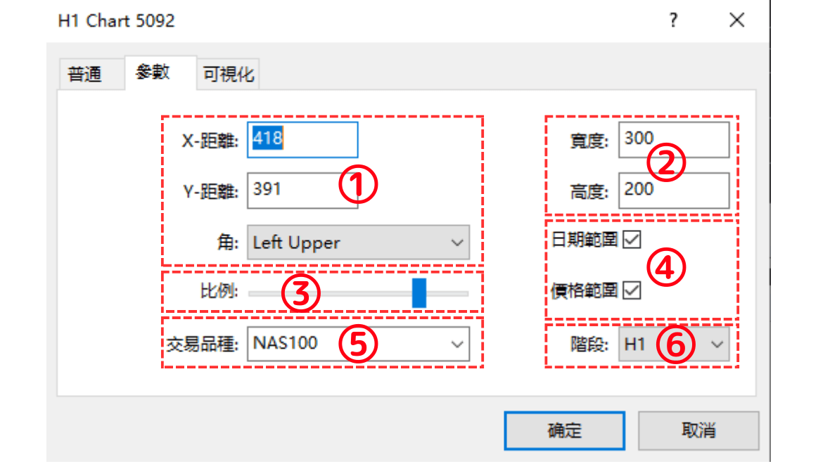 在显示的视窗中,可以在「参数」部分调整显示位置(①)、大小(②)、放大缩小(③)、刻度(标尺)的显示(④)、交易品种(⑤)和时间周期(⑥ )的设定。