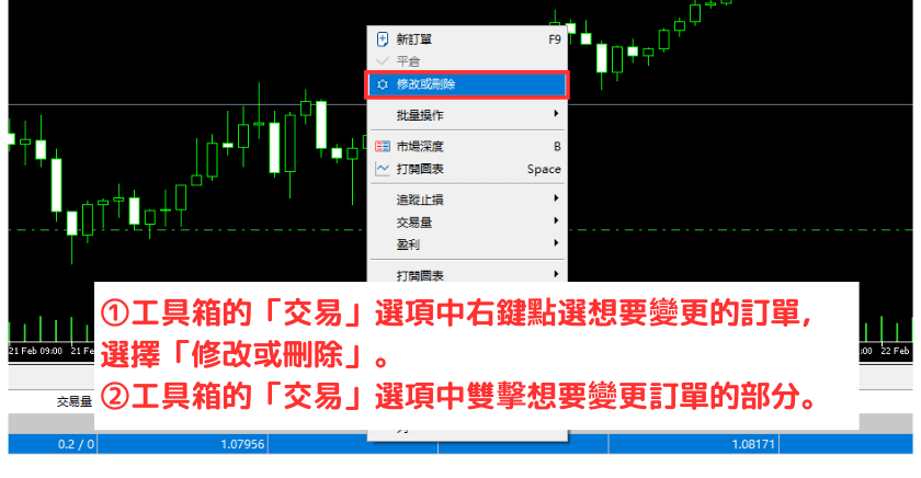 在工具箱的「交易」选项中右键点选想要变更的订单,选择「修改或删除」即可显示。