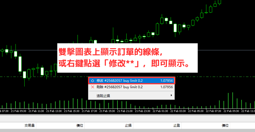 双击图表上显示订单的线条,或右键点选「修改**」,即可显示。