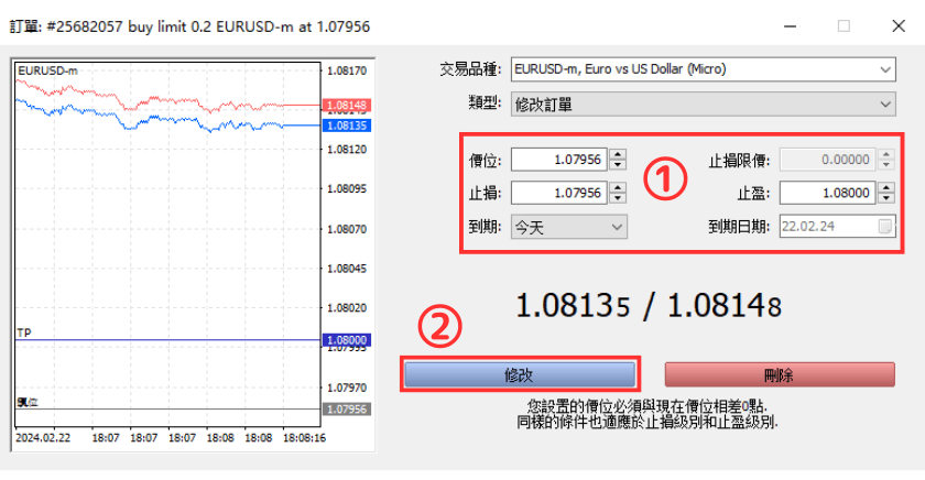 在MT5(MetaTrade 5)中,可以对限价挂单/止损挂单中的价格、有效期限等项目进行修改。 也可以直接取消限价挂单/止损挂单。
