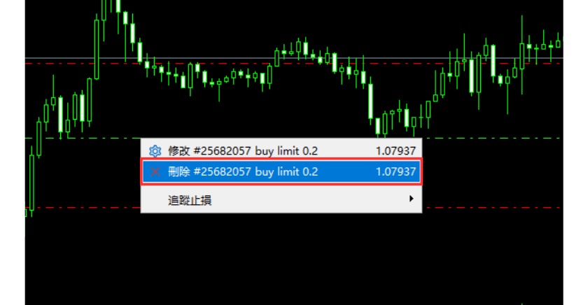 将游标放在要取消的订单水平线上,然后右击,选择「删除」。