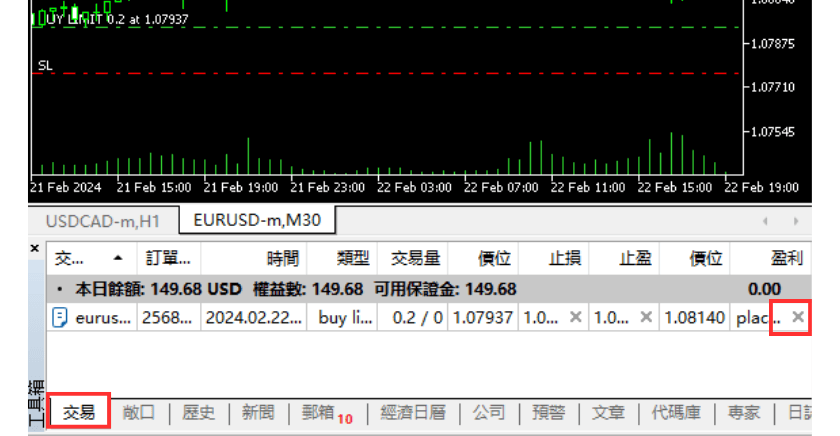 如果设定了一键交易,直接在下方工具箱内的「交易」中,选择要取消的订单,在订单最右侧点击「X」按钮,即可快速完成挂单的删除。