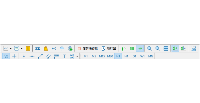 MT5 顶部的选单栏。可以从此功能表列执行大多数基本操作。