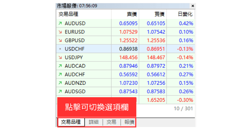 「交易品种」选项栏中可以查看交易品种的卖价、卖价、最高价、最低价等;「详细」选项栏中可以查看详细的数据;「交易」选项栏中可以显示一键式交易面板,「报价」选项栏中可以查看即时走势图表。