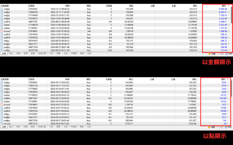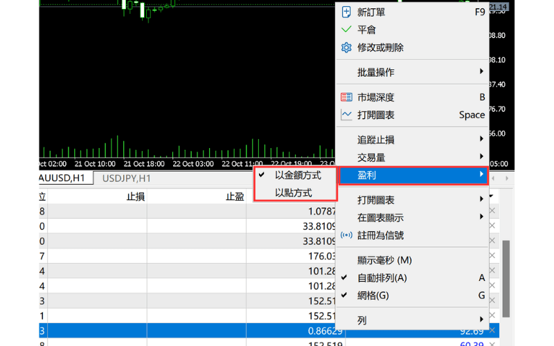 在工具箱的「交易」标签页内,右键点击您所持有的仓位,从显示的选单中选择「盈利」下的「以金额方式」或「以点方式」。