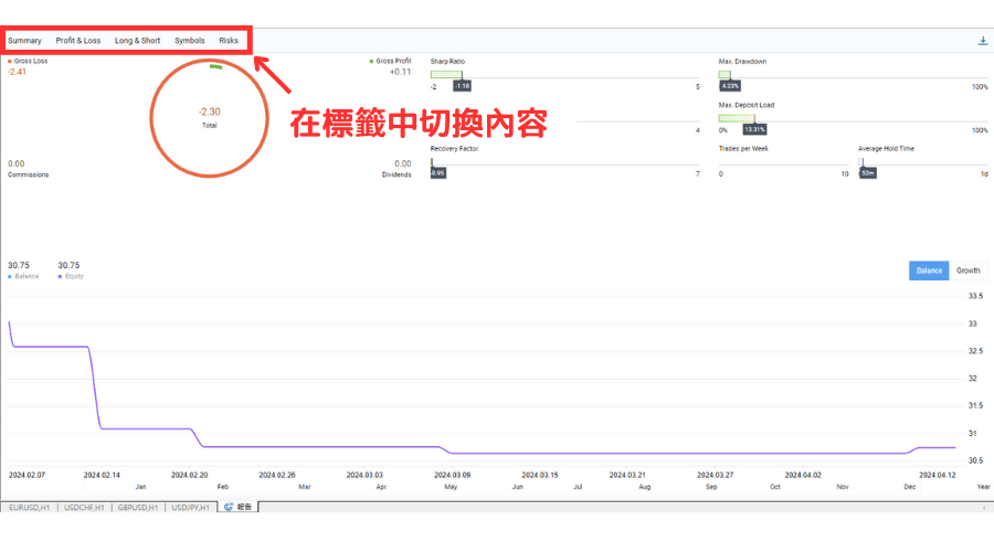 这样在图表区域中就会显示交易概述。 可以通过上方的标签切换内容。