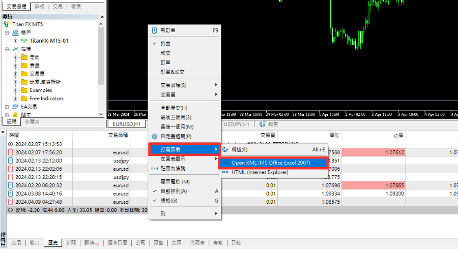 在「历史」标签中点击右键,然后点击选单「打开图表」中的「Opne XML」。