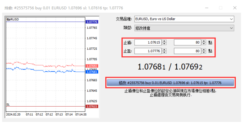 在显示的「持仓」界面上分别输入要变更的止损和止盈价格。 然后按一下「修改**」按钮以完成更改。