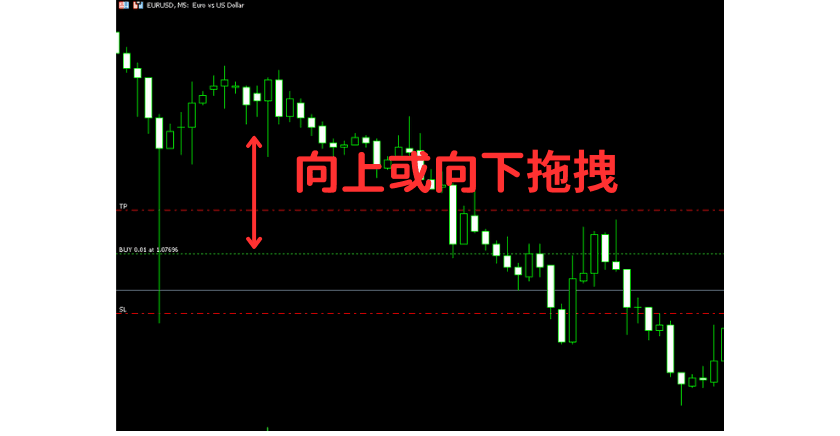 如果想要对之前设定的止盈、止损价格进行修改时,直接将游标放TP或SL线上,并按住左键,将其拖拽至想要设定的位置,即可完成修改 。