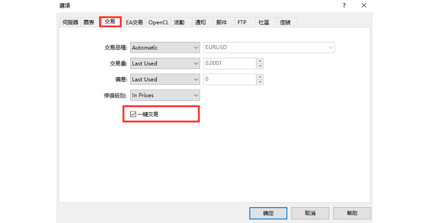 一键交易可以在「工具」-「设定」中的「交易」选项中设定。