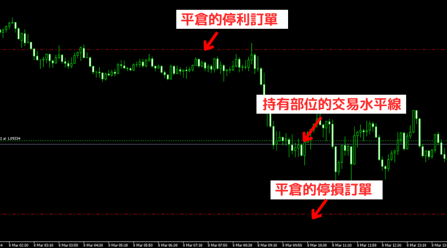 未成交的限价挂单和止损挂单也会用绿色线条在图表中显示。 另外,与其挂单相关的平仓止盈单和止损单也会用红色线条显示。