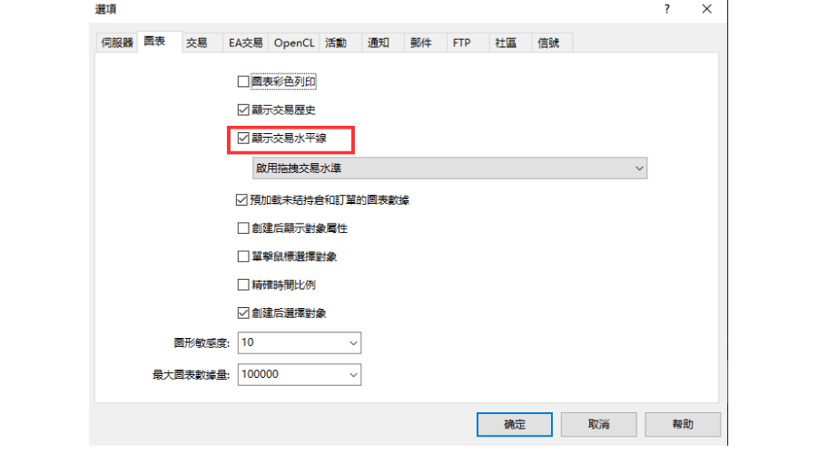 点击MT5菜单「工具」中的「选项」,然后点击「选项」视窗中的「图表」标签,勾选「显示交易水平线」的话就可以显示,取消勾选的话就会关闭。