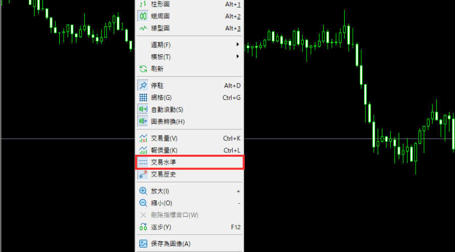 在设置为勾选「显示交易水平线」的状态时,在图表中点击右键将会显示菜单,然后点击菜单中的「交易水准」就可以切换为显示或关闭。