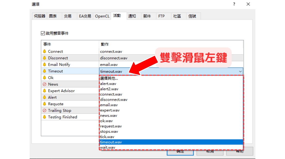 在显示的选项视窗中,选择「事件」标签。这里会显示一系列的事件列表,双击您想要更改的事件「动作」栏,然后从下拉选单中选择您想使用的声音,并点击「确定」。
