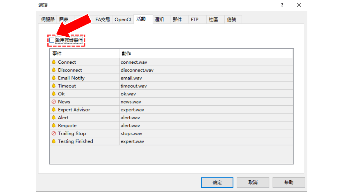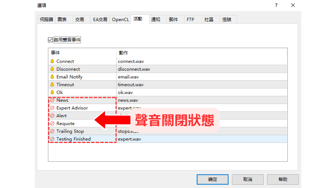如果您只想停止某些特定声音,请确保「启用声音事件」的勾选框处于勾选状态,然后双击事件列表中的「动作」栏位,可以切换声音的开启或关闭。