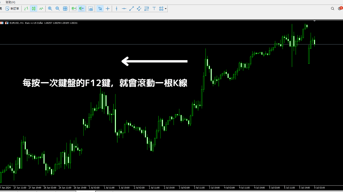 回到想要作为起点的过去数据后,每按一次键盘的F12键就会滚动一根K线。
