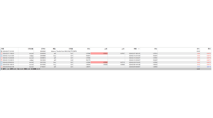 | 类型 | balance : 入金出金 Buy : 买入 Sell : 卖出 Buy limit: 买入限价单 Sell limit: 卖出限价单 Buy stop: 买入损单 Sell stop: 卖出止损单 |