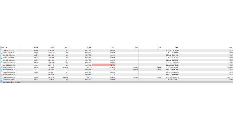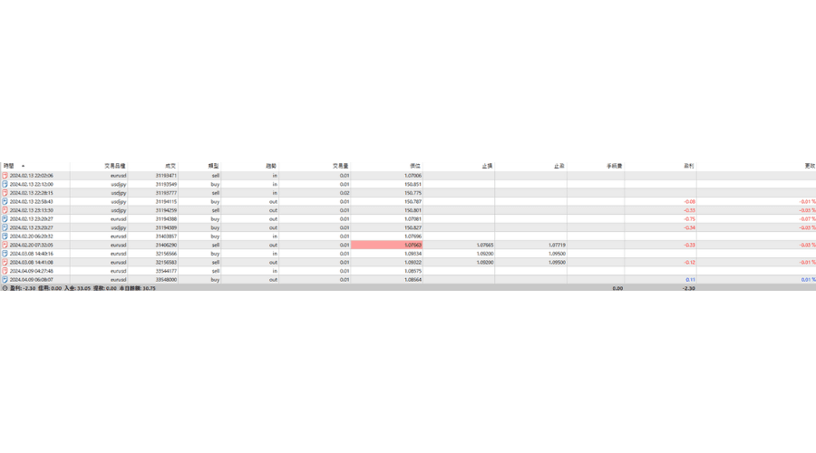 | 类型 | 【订单】 balance : 入金出金 Buy : 买入 Sell : 卖出 Buy limit: 买入限价单 Sell limit: 卖出限价单 Buy stop: 买入损单 Sell stop: 卖出止损单 【成交】 in:新单 out:结算 |