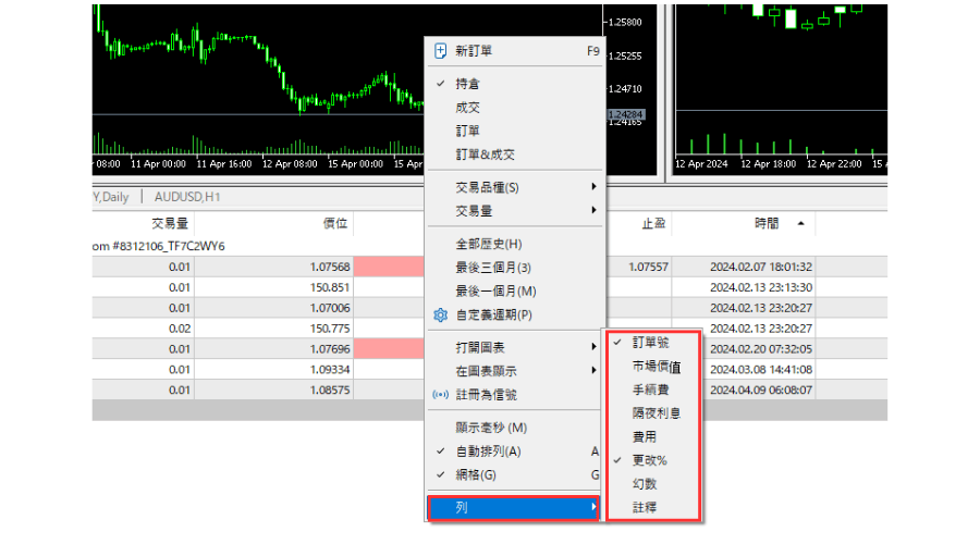 在「订单&成交」中,会分成2行(上方为订单,下方为成交)确认每个订单与成交的以下内容。