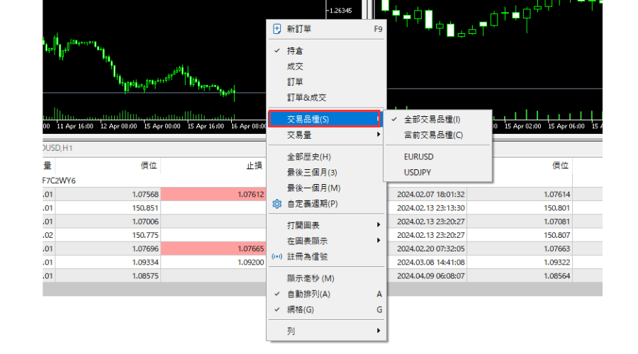 在「历史」标签中点击右键,在「交易品种」的选单中可以筛选交易品种。